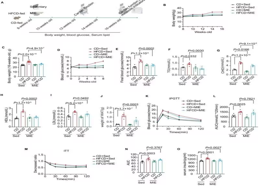 研究人员给予小鼠正常饮食(CD)和高脂饮食(HFCD),采用HFCD饮食构建小鼠高热量饮食模型。将CD或HFCD喂养的小鼠随机分为久坐(Sed)和中等强度运动(MIE)组,监测小鼠体重、血糖、血脂、胰岛素水平和胰岛素敏感性等全身代谢状态改变。检测发现相比于CD小鼠,HFCD小鼠血糖、血脂、血清胰岛素水平、体重及脂肪含量显著增加,胰岛素敏感性受损。而MIE条件有效阻止了HFCD小鼠体重增加,并改善了小鼠的全身代谢状态。这些发现表明MIE足以预防饮食诱导的肥胖(DIO)和代谢综合征。